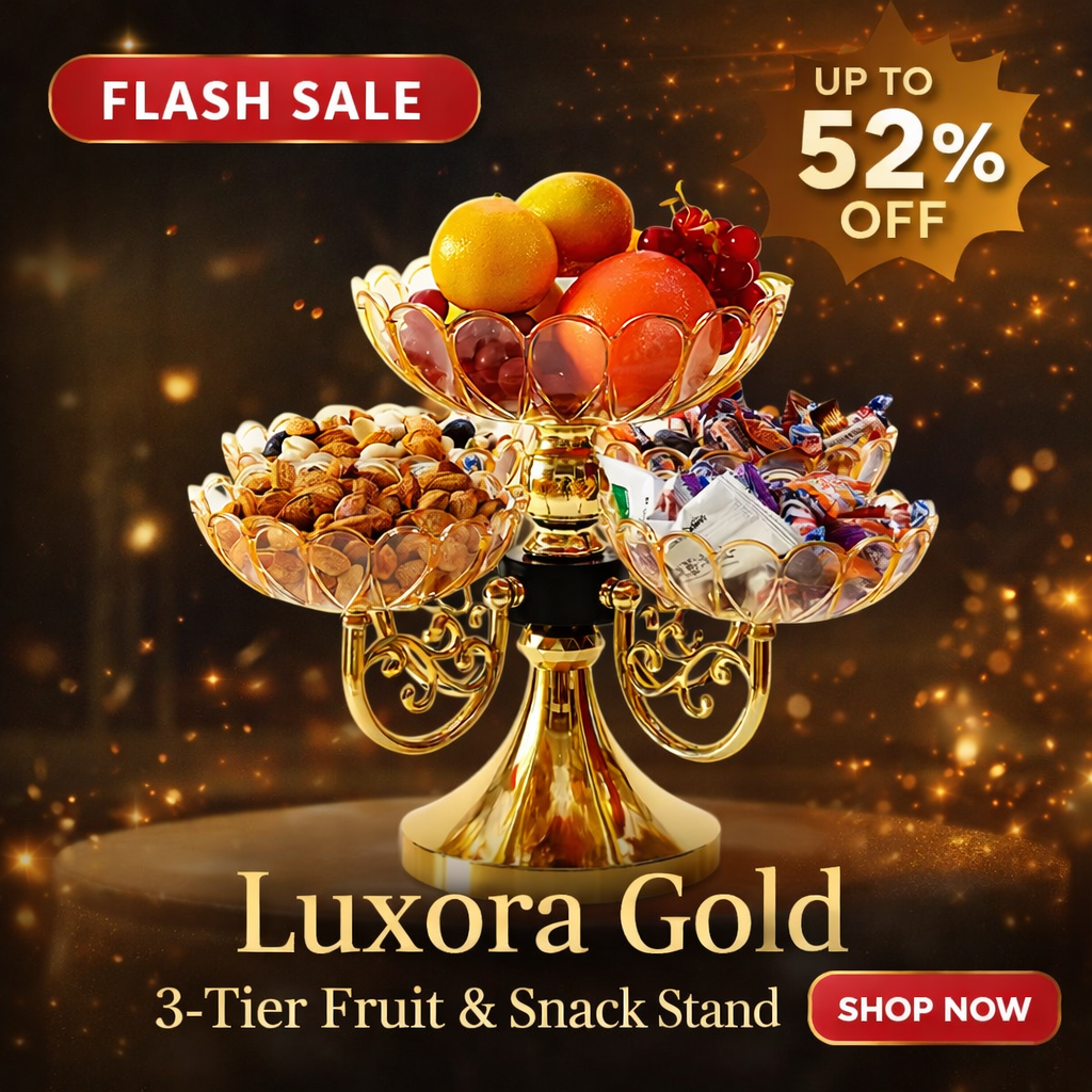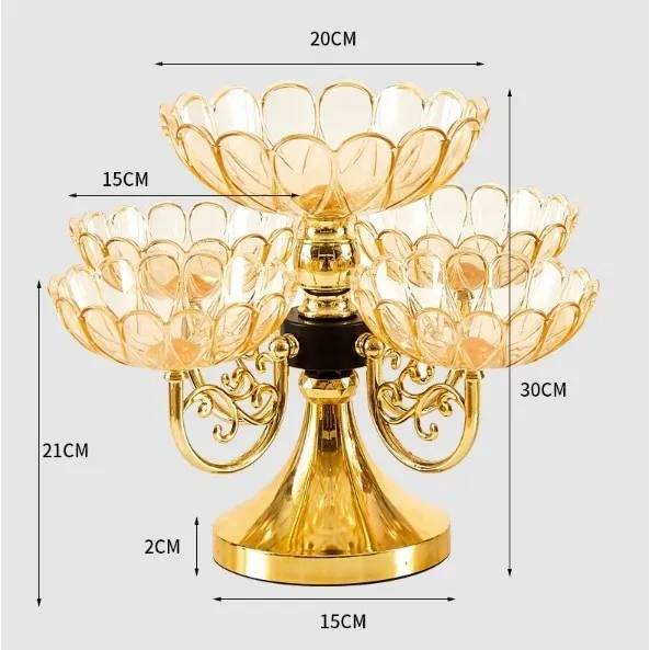 Tempat buah & snack 3 tingkat dengan desain elegan warna emas yang membuat meja lebih rapi dan estetik.