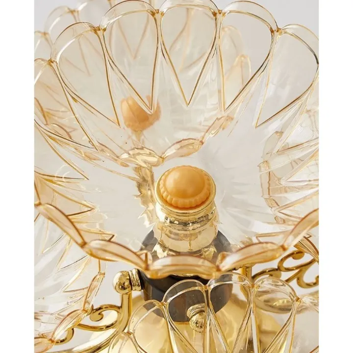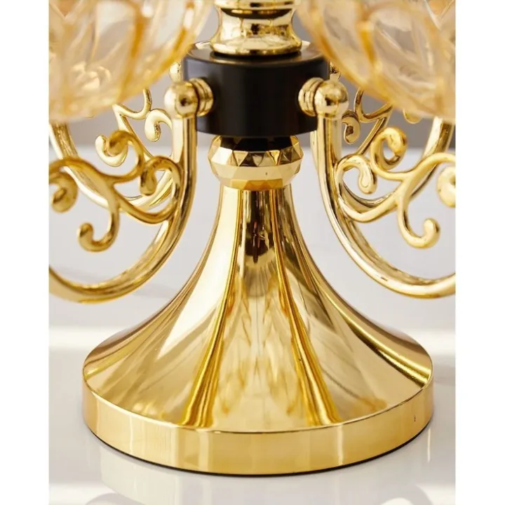 Desain kristal beraksen emas yang memancarkan kemewahan, menyempurnakan keindahan dekorasi meja tamu saat Hari Raya.